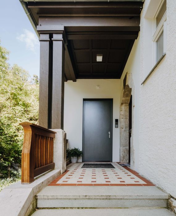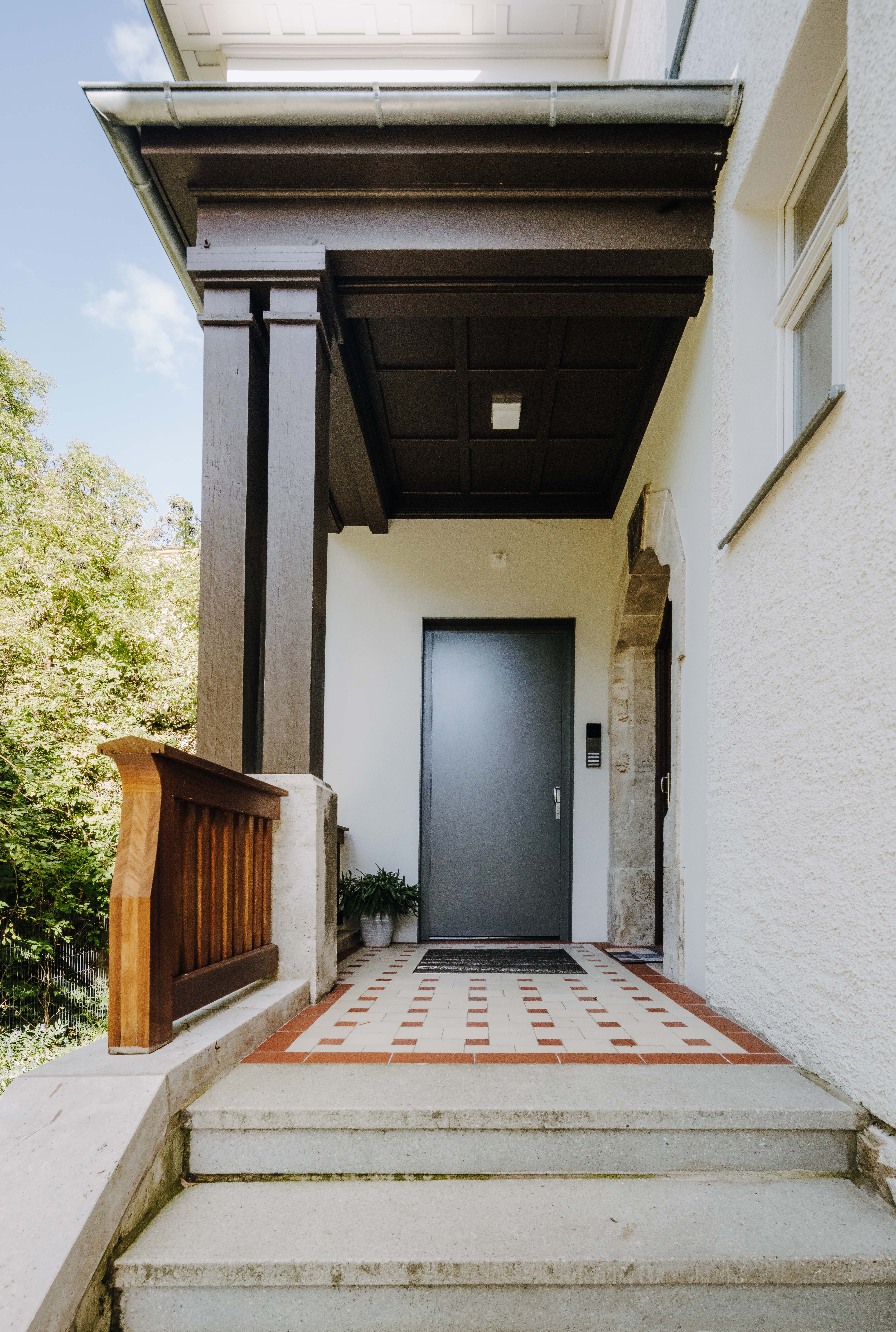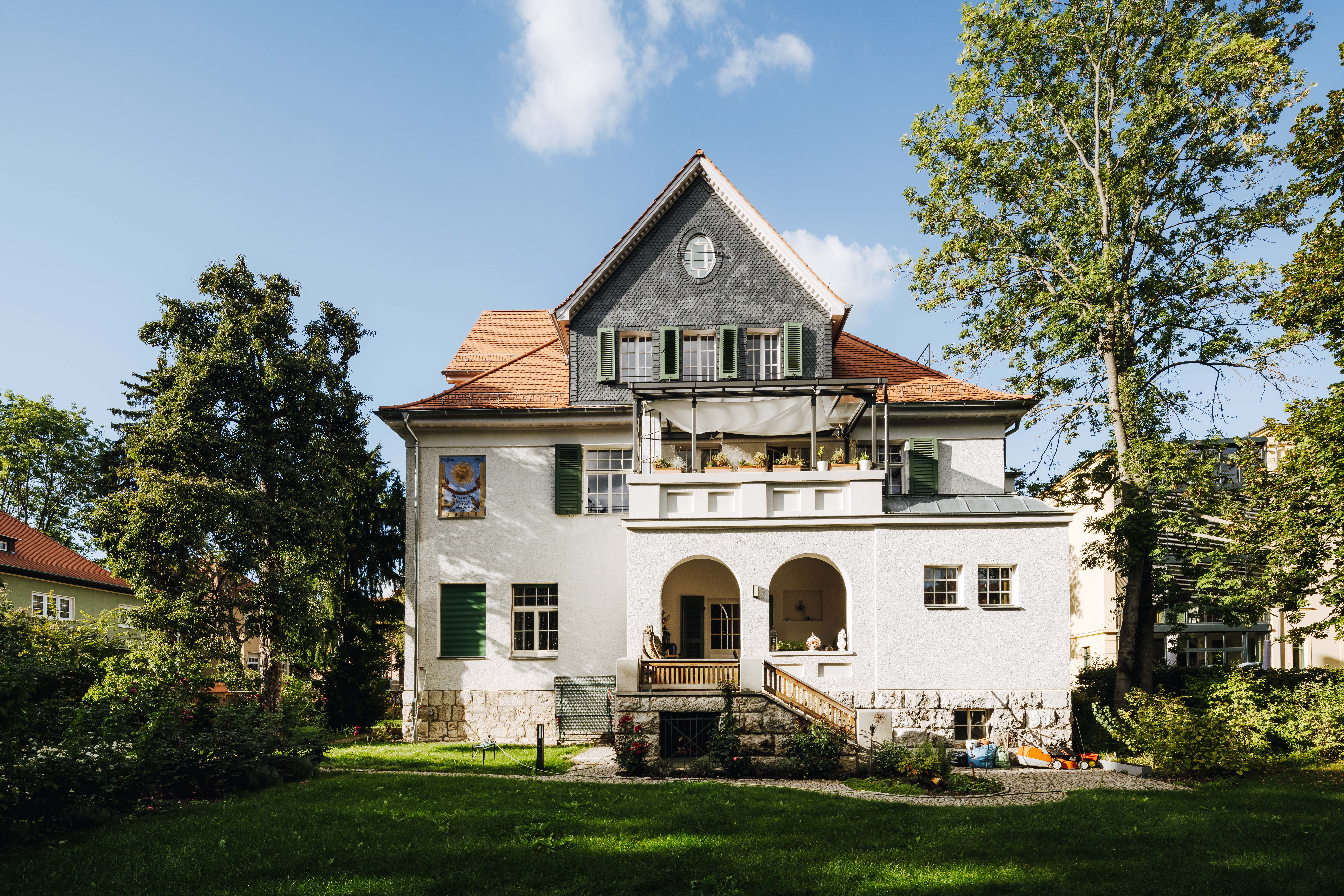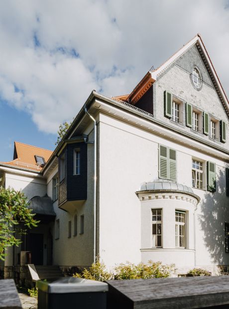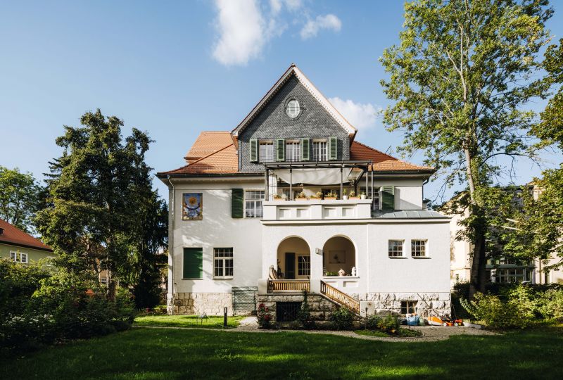 Die Grundstruktur im Inneren des Hauses, sowie die Einbauten, wie Türen, Treppen war weitestgehend erhalten, ebenso die Fenster mit Fenster- und Rolläden, besondere Fassadenelemente, wie eine Sonnenuhr, besondere Tür- und Fenstergewände, sowie die Schieferwandverkleidung der Gaupen und Erker. Die Villa mit Garten und Zaunanlage steht unter Denkmalschutz. Die Aufgabe bestand darin, das Einfamilienhaus in ein Mehrfamilienhaus umzubauen und dabei die vorhandee Raumstruktur, sowie die gut erhaltene Substanz mit allen vorhandenen Details zu erhalten und wieder erlebbar zu machen mit einem hohen Anspruch an die Ausstattung und Gestaltung der zukünftigen Wohnungen. Wir haben ein neues Treppenhaus eingebaut und die Villa nach Osten um einen Anbau erweitert, um die vier neuen Wohnungen optimal erschließen und die ursprüngliche Struktur der repräsentativen Räume erhalten zu können. Es wurden zum großen Teil die Kastenfenster und sämtliche Innentüren, Wandvertäfelungen, etc. aufgearbeitet. Bei den Ausbau- und Sanierungsdetails haben wir uns in der Herangehensweise am Reformstil orientiert und diese mit zeitgemäßen Materialien umgesetzt. Der Fassadenputz wurde rekonstruiert. An den Zwerchhäusern und dem Eingangserker wurden die verwendbaren, abgenommenen Schieferplatten als Fassadenverkleisung wieder angebracht und im gleichen Format durch neue Platten ergänzt. Der neue Anbau wurde dezent auf der Gartenseite angesetzt. Der Fassadeputz und die Natursteinsockelverkeidung führen die Altbaufassade fort und unterscheiden sich nur in der Oberflächenstruktur. Im Garten wurden die vorgefundenen Wegeachsen rekonstruiert unter Verwendung der historischen Wegerandsteine und Pflasterung. Die Zaunanlage zur Jahnstraße wurde anhand der historischen Zeichung ebenfalls rekonstruiert.
